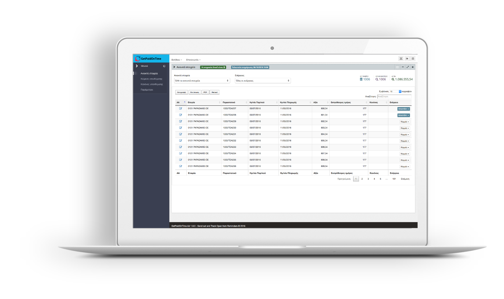 Το Get Paid On Time είναι το εργαλείο που θα σας βοηθήσει να εισπράξετε τα τιμολόγιά σας γρηγορότερα. Μόλις σε 10 λεπτά μπορούμε να εγκαταστήσουμε το πρόγραμμα και αμέσως το σύστημα μπορεί να ξεκινήσει και να ενημερώνει αυτόματα τους πελάτες σας για τις οφειλές τους προς εσάς.